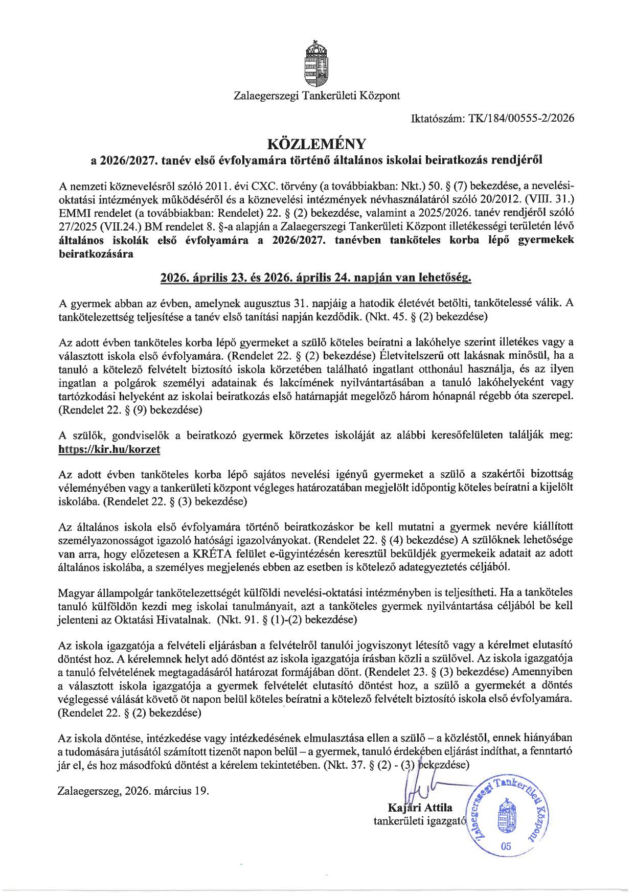 Beiratkozás az általános iskolába 2026